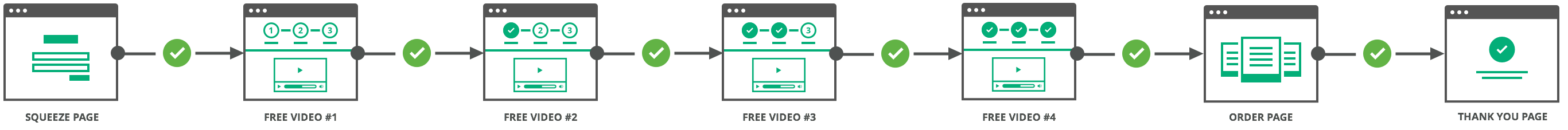 It consists of:Â Squeeze Page + Free Video #1 + Free Video #2 + Free Video #3 + Free Video #4 + Order Page + Thank You Page
