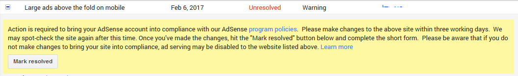 “Action is required to bring your AdSense account into compliance with our AdSense program policies. Please make changes to the above site within three working days. We may spot-check the site again after this time. Once you’ve made the changes, hit the “Mark resolved” button below and complete the short form. Please be aware that if you do not make changes to bring your site into compliance, ad serving may be disabled to the website listed above. Learn more “