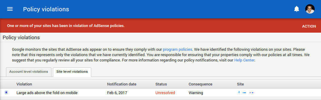 - Site-level violation simply means that one or more of your sites are violating Adsense policy/or webmaster guidelines. Site-level violations can simply be resolved by taking the required action and fixing the violation on your website, which may include things like editing content, removing ads, changing ad layout, ..etc. If you don’t take the required action within a certain time, ad serving may be disabled.