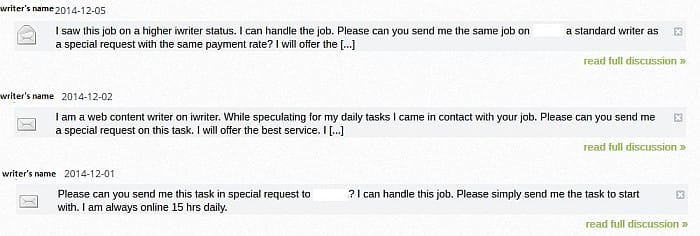 I remember that after I had submitted some article projects for my favorite writers, I found messages coming to my iWriter inbox from different writers who were offering their writing service, that’s why I was saying earlier that I Writer has tons of writers who are willing to take up any project. Here are some examples of msgs I have received: