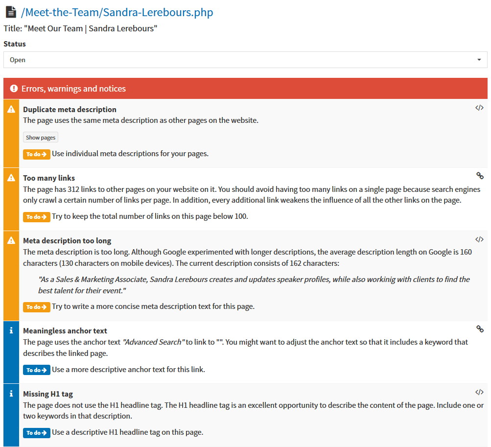 Warnings (Marked in ORANGE color): These warnings help you ensure that your web pages get the best possible rankings. You should fix these warnings once you are done with fixing the errors mentioned above.