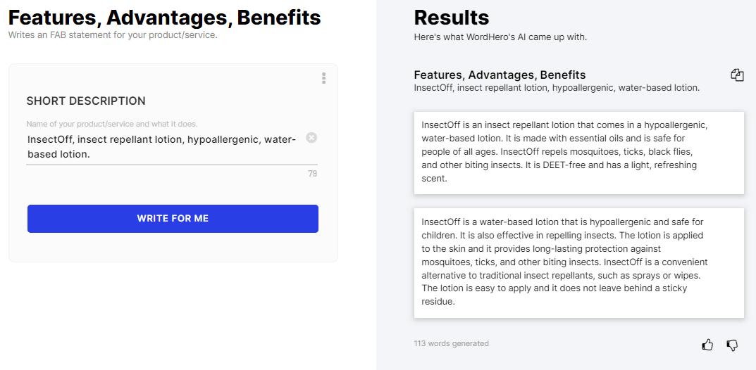 This tool lets you create product descriptions for your Amazon listing. The generated descriptions follow the Amazon style. You simply enter the product name followed by some features or benefits, then Wordhero will generate the product description for you. This tool is great not just for Amazon descriptions, but for any kind of eCommerce descriptions that you want to create for your online store.