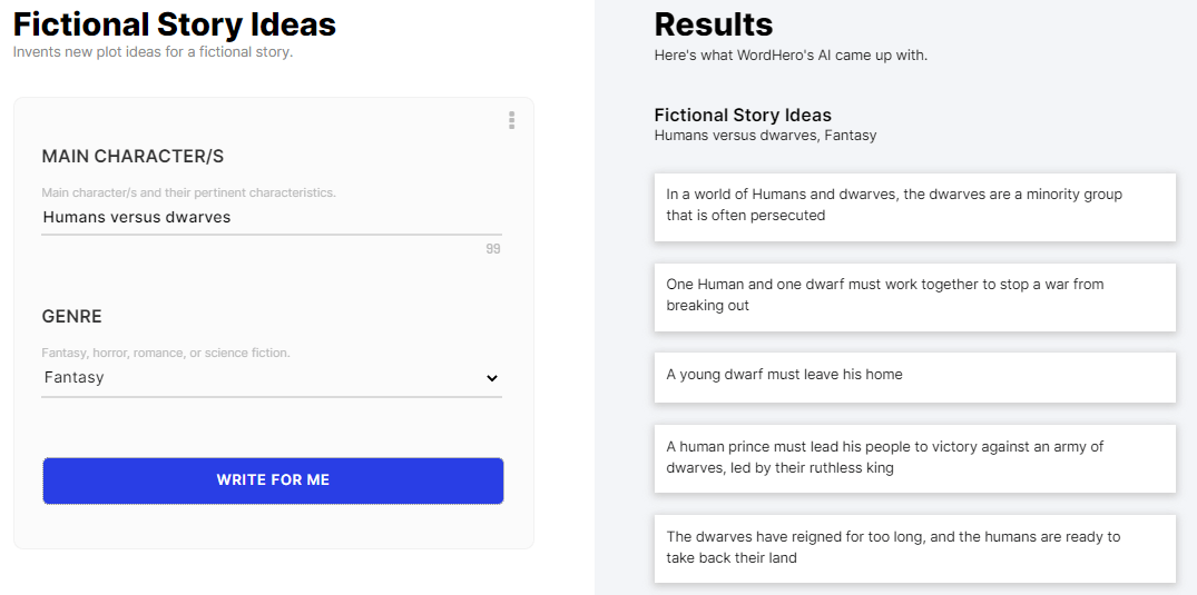 This tool lets you generate ideas for your story. You can use it to generate imaginative fiction ideas (Fantasy Story), horror story ideas, romantic-themed ideas, science fiction ideas, and more. You simply need to enter the main characters of the story and their main characters, and enter a Genre (Fantasy, Horror, Romance, Science Fiction Story, ..etc). Then, Wordhero AI will generate the story ideas for you.