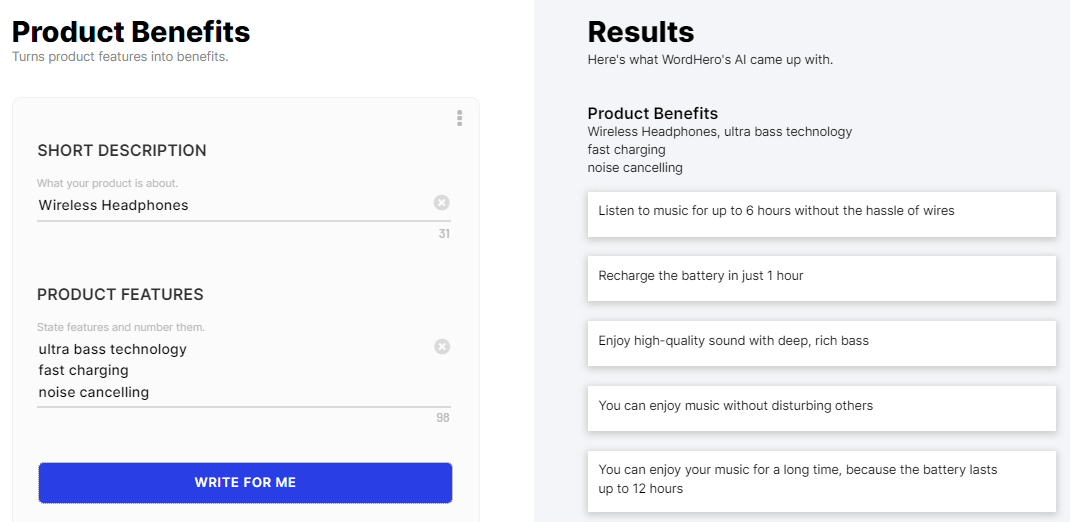 This tool lets you create the best copywriting formula or marketing copy for your online ads, social media posts, website, and more. You only need to input a short description of your product and include some important features then Wordhero will generate the copywriting formula for you.